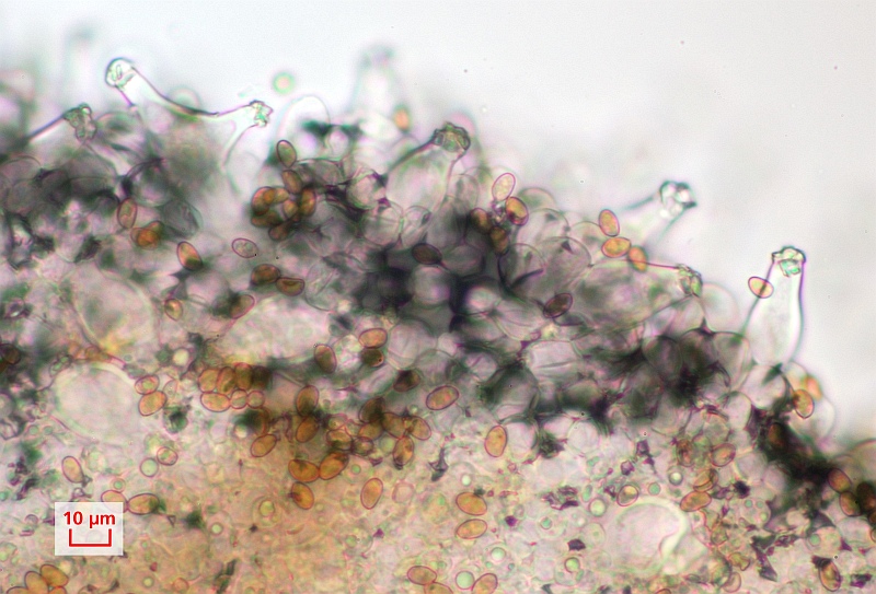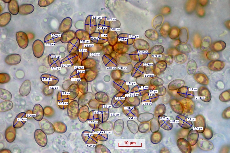 und schließlich die glatten, oval bis mandelförmigen, im Licht hellbraunen Sporen mit Keimporus, Abmessungen (4,8-) 5 (-5,5) x (7,3-) 8,1 (-9,7). Passt wunderbar auch zu Matthias' (Be)Fund aus dem letzten Jahr (siehe da). Gruß