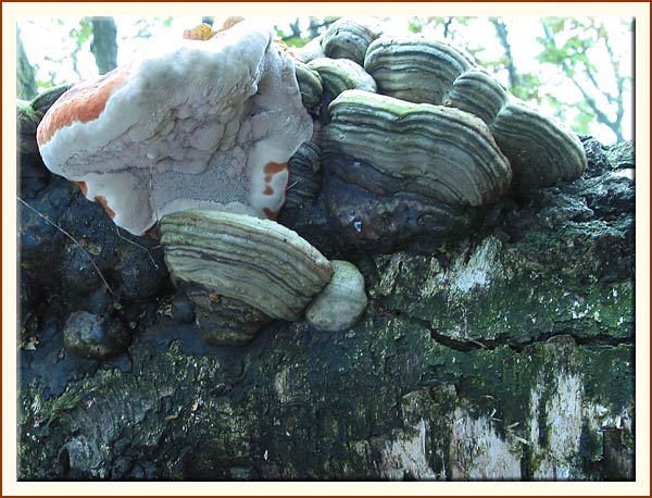 3. Piptoporus betulinus (Birkenporling) - wächst an einem gefälten Birkenbaum.