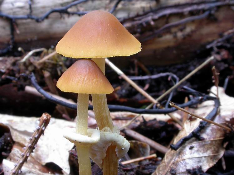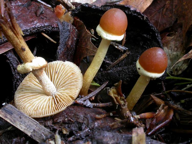 Infos: Hutdurchmesser: 1-2,5 cm; Stiel: teils sehr lang und manchmal stark verbogen, mit auffäligem, dicken Ring; Mehr Kopfzerbrechen bereitet mir dieser Pilz, der einsam auf einem bemoosten Buchenstumpf wuchs. Gefühlsmäßig würde ich auf einen Dachpilz tippen (vielleicht Pluteus salicinus). Einen Rettichgeruch konnte ich allerdings nicht feststellen und einen Rauschzustand dürfte ich mit dem mickrigen Exemplar auch nicht hinkriegen.