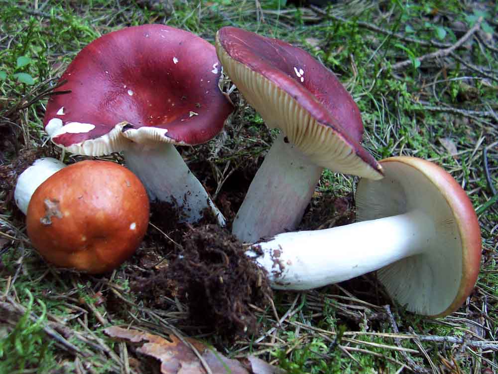 Die nachfolgenden Täublinge wuchsen an Fichten. Der Stiel ist sehr brüchig, nicht aber die Lamellen, die sind elastisch. Lamellen im Alter cremefarben, Stiel rötlich überhaucht. Hut jung rotorange und bucklig, im Alter intensiv rot und trichterförmig. Geschmack schwach scharf, geruchlos (für mich). Der Pilz war heute Massenpilz. Leider habe ich wie so häufig bei Täublingen keine Ahnung, R. vesca wäre der einzige Tip wg. der biegsamen Lamellen. Habt Ihr eine Idee?