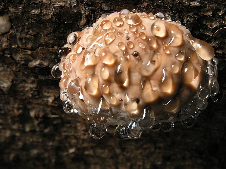 Junger Rotrandiger Baumschwamm (Fomitopsis pinicola) mit Guttationstropfen