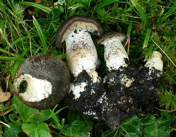 Auf dem Friedhof selber hab ich dann außer Stadtchampignons, einem Fransenwulstling, grünen und gelben Knollenblätters, diese ausgerissenen "Minibüschel" gefunden, Hutdurchmesser beim größten zwei cm. Denke das sind Raslinge so um decastes oder loricatum. Auffällig die fast schwarze Hutfarbe. Oder was fällt euch dazu ein?