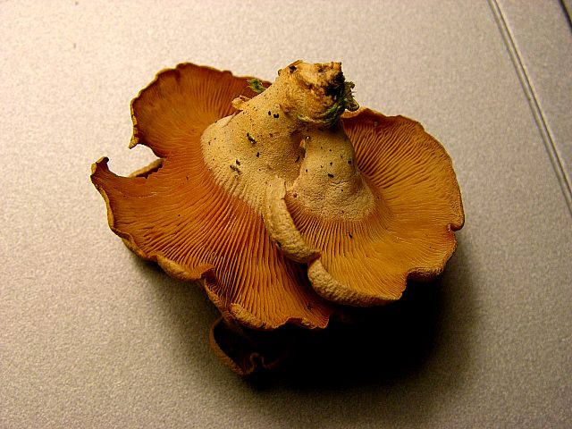 Mit Ansicht von unten wegen der "dicht stehenden Lamellen, scharf von dem kurzen, nach oben verdickten Stielchen abgesetzt" (= Jahn, Pilze an Holz Nr. 164):
