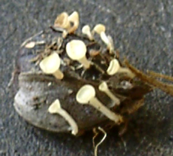 Wenn ich solche Pilze fotografiere, räume ich immer ein bisschen das Sichtfeld frei. Bei der Gelegenheit fand ich hinter dem Stiel eines kleineren Pilzes dieses Samenkorn, das von Pilzen besiedelt ist. Ich habe leider kein wirklich scharfes Bild hinbekommen, und eine Bestimmung ist sicher auch unmöglich.