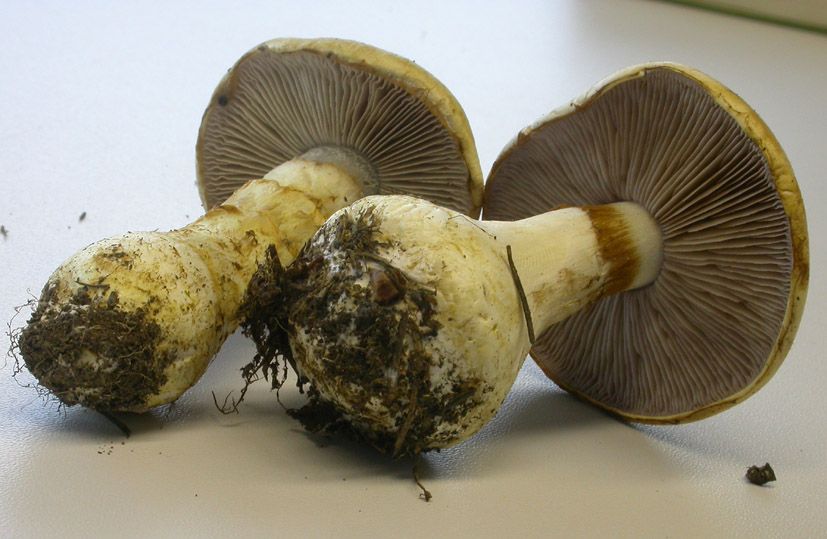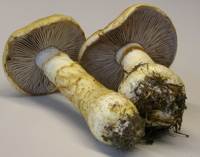 Ihr seht rechts Cortinarius varius mit seinem semmelfarbenen Hut, der oft ein helles Rändchen hat, seinem weissen Fleisch, den vor allem jung sehr lebhaft violetten Lamellen, die mit der Zeit immer rostbrauner werden, dem keuligen, höchstens leicht knolligen Stiel mit den schön ordentlich im oberen Bereich umgebundenen Velumresten.