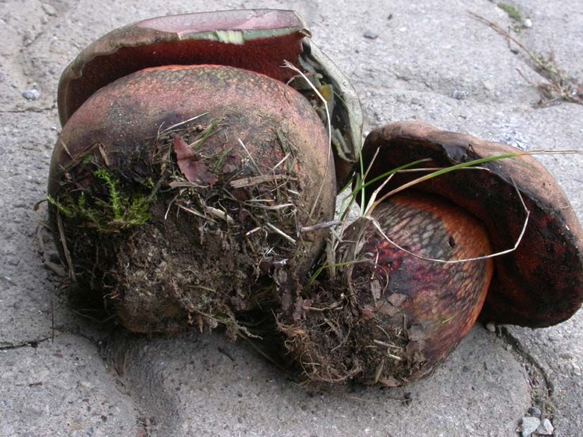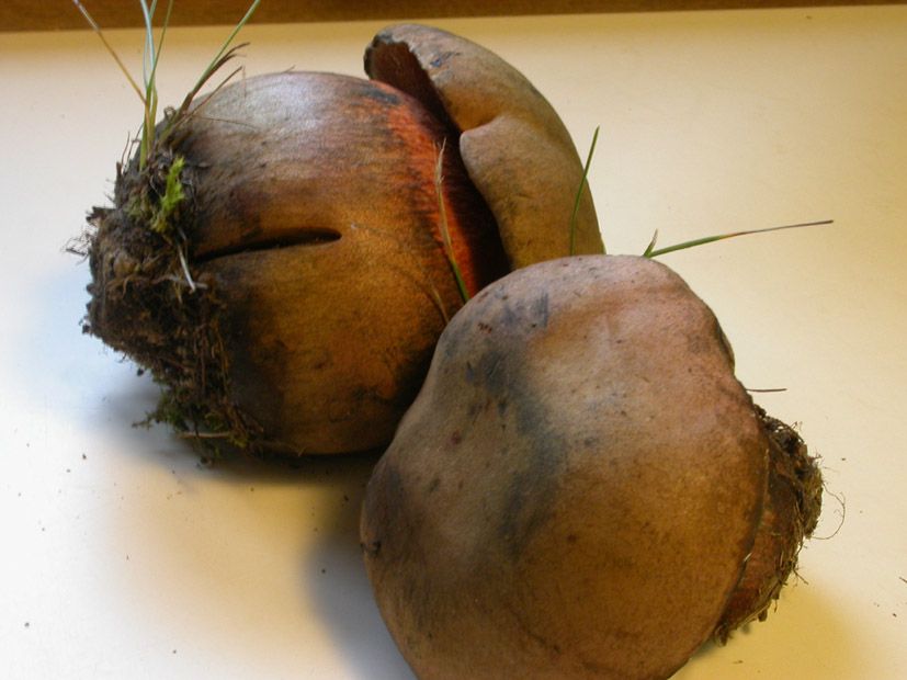 Tatsächlich, da ist eine Netzzeichnung zu sehen. Ich schnitt ein Stück Hutrand ab, und da erschien neben dem roten Rand zwischen Hut und Röhrenfutter (kommt leider auf dem Bild nicht deutlich raus - spricht für Netzstieligen) auch diese merkwürdige, kränkliche Rot-Verfärbung im Hutfleisch: