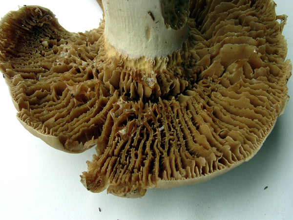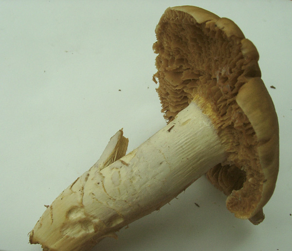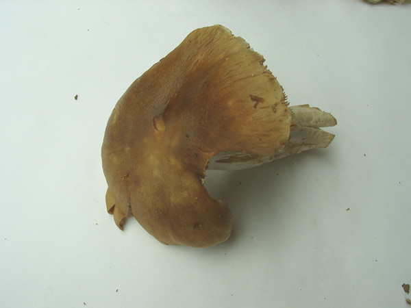 Hallo, gestern fand ich im Mischwald (Buchen, Eichen, Miefern und Fichten möglich..)diesen Pilz, den ich nirgends einordnen kann. Der Pilz ist recht stattlich und stand ganz allein im Wald, ich konnte kein weiteres Exemplar entdecken. Die Huthaut war schleimig, der Stiel trocken. Einen Geruch kann ich nicht feststellen. Di Lamellen sind im Grund zahlreich verwachsen, wie man an den Fraßstellen gut sieht. Ich kann diesen Pilz nicht einordnen.