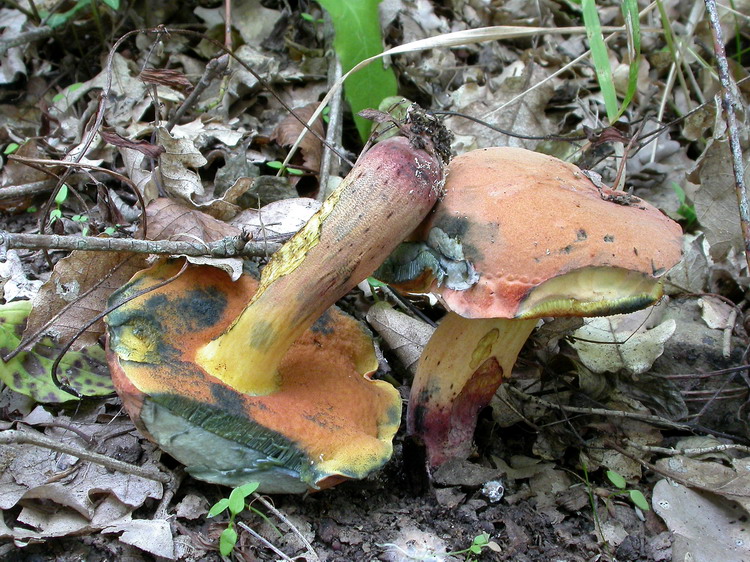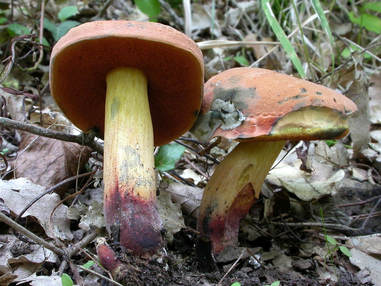 So, jetzt kommen die Boleten. Vor allem an Wegrändern unter Eichen fanden wir recht häufig Hexenröhrlinge mit auffallend orangebraun gefärbten Hüten und glatten Stielen: