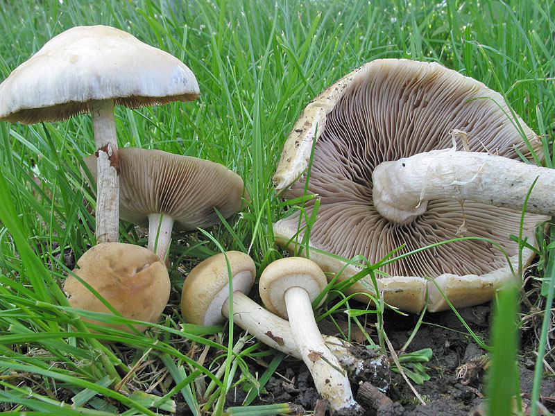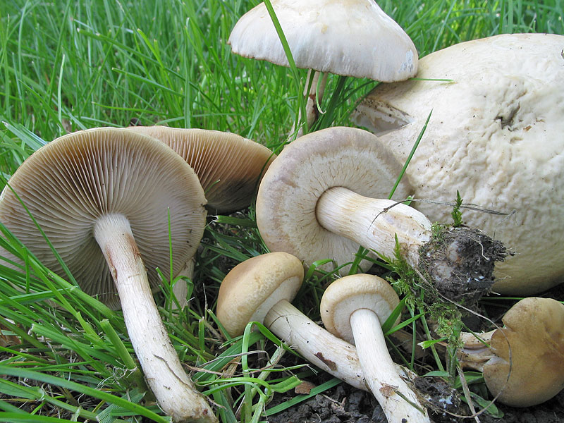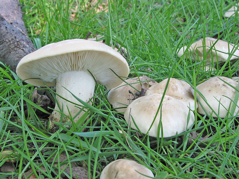 1. Ich würde sagen: Maipilz. Etwas verwirrend ist die Farbe des Hutes: hell bräunlich (also nicht ganz weiß). Die Sporenfarbe: sehr hell, vielleicht aber sind diese Fruchtkörper noch sehr jung?- (bei Maipilz soll sie weiß sein?). Auf dem zweiten Bild ist der Fundort zu sehen - direkt an der B54 unter einer Birke und Eiche, auf dem Rasen - in Hexenringen (auf dem Foto ist einer von den Hexenringen zu sehen). Stiel ziemlich kompakt, Geruch pilzig-mehlig, Geschmack etwas scharf. Vielleicht doch kein Maipilz?