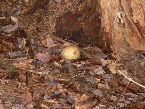 nicht weit davon an einer Baumwurzel ein seltsames eiförmiges Etwas.