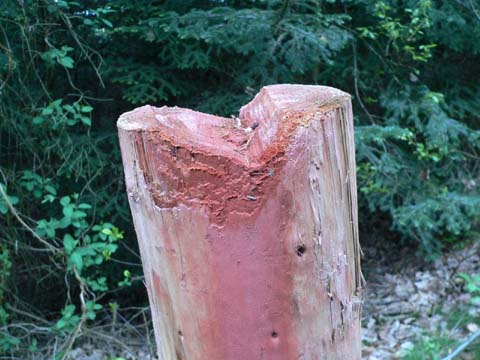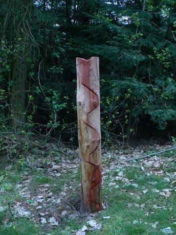 Bei meinem Goldröhrlingsstandort steht etwas im Wald, was wie ein Marterpfahl aussieht. Ein eingegrabenes Rundholz mit schrägen Einschnitten, oben etwas ausgekehlt mit irgend etwas rotem darauf, was daran runter läuft. Dekoratives Element oder hat das irgend einen Zweck?