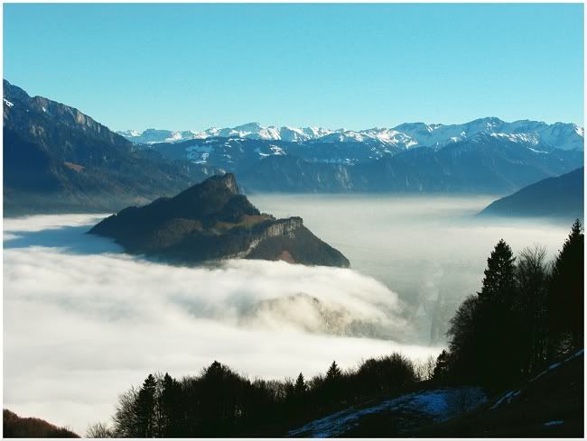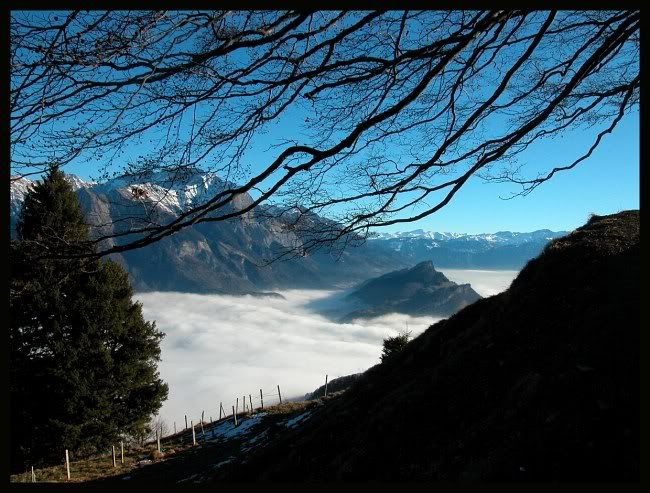 von der Hütte aus sieht man, wie sich das Nebelmeer wie ein Wasserfall über den Luziensteig ins St. Galler Rheintal ergiesst: