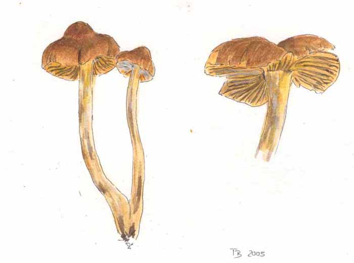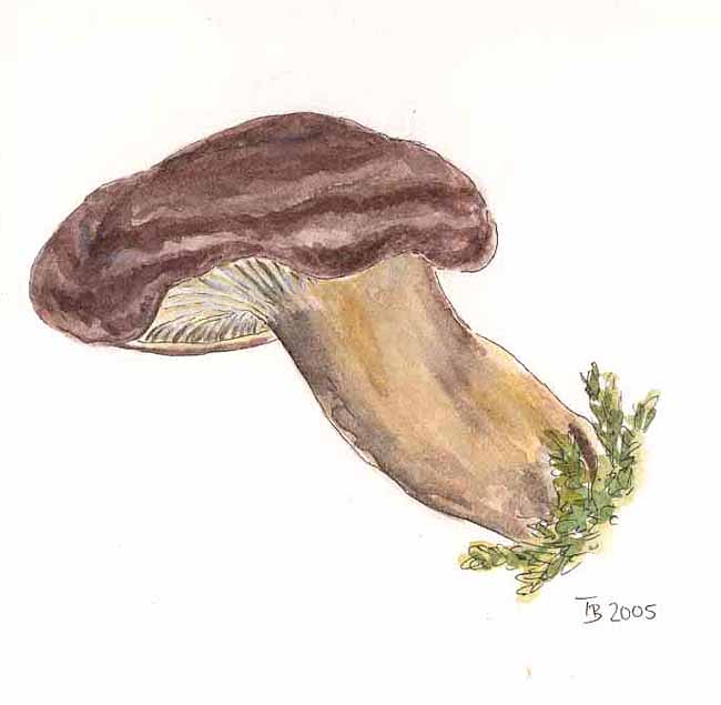 Hallo Felix, das ist ja schon ein erstaunlicher Zufall! Genau diese beiden Dir unbekannten Pilze waren auf unserer Exkursion südlich von Untergneuß die interessantesten Funde und Tanja hat zwei Aquarelle angefertigt. : Zum Schluß zwei Unbekannte: UPO 1: Das ist ein Cortinarius aus der Untergattung Hautköpfe (Dermocybe).