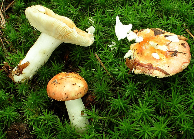 Hier komm ich gar nicht weiter: Brennend scharfer Weissporer, klein und sehr zerbrechlich mit schwammigem brüchigen Stiel und säuerlichem Obstgeruch. Die Hutfarbe kommt im Bild gut rüber, und ist mit mehr orangerosa mit gelbockerlichen Flecken deutlich verschieden von den typisch roten emetica/mairei Farben, die ich gestern auch verbreitet gefunden hab. Ist auch ohne sporen ein tip drin?