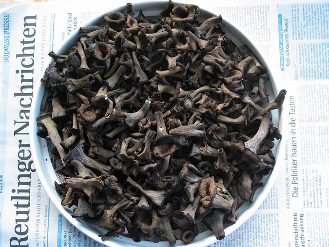 dort wo ich sonst im Herbst Totentrompeten finde, wachsen sie jetzt, nicht in den gewohnten Mengen, aber unübersehbar. Im letzen Herbst fand ich an dieser Stelle gar keine.