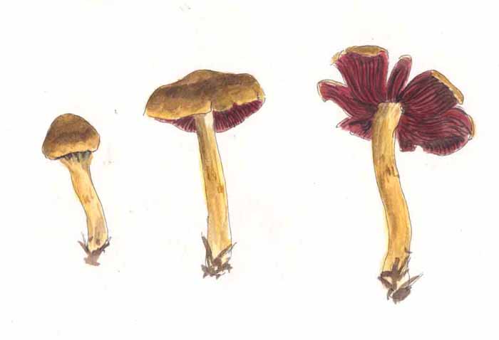 Ich denk du hast den Blutblättrigen Hautkopf (Cortinarius sanguineus) gefunden.