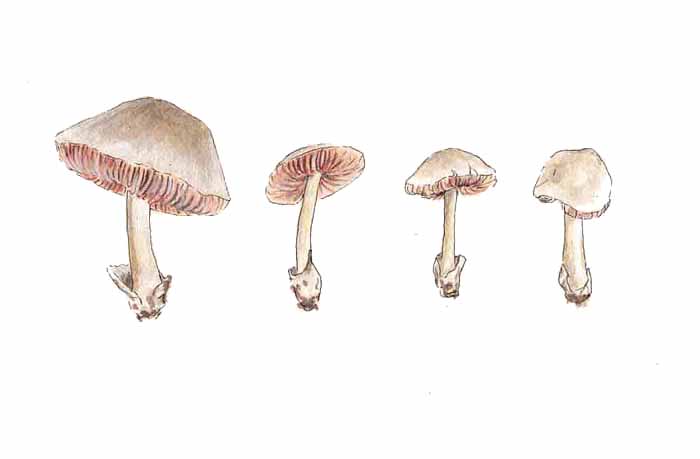Letzte Woche habe ich hier in Jena zum ersten Mal ebenfalls Volvariella pusilla entdeckt, in einem kurzgrasigen Strassenbankett neben einer Bushaltestelle, schön umrahmt von alten Zigarettenkippen, Tempos und ähnlichem. Auf dem Heimweg dann überraschenderweise vor unserer Haustüre in einem zwei Fuß breiten Strassenbankett zwischen den Strassenbahnschienen und der Hauptstrasse nochmals zwei Exemplare!