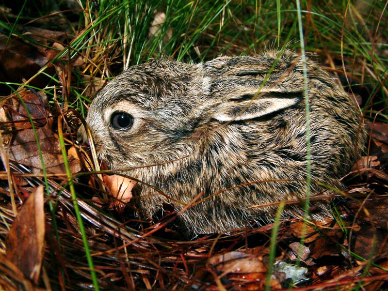 Ich war heut in einem lichten, grasigen Buchenwald unterwegs, als plötzlich dicht vor mir, hinter einer Stubbe, ein Feldhase aufsprang und das Weite suchte. Ich dachte mir im ersten Augenblick "wie mutig, der hat mich ja nah rankommen lassen", dann sah ich den Grund: Ein kleines Häschen im Gras hinter der Stubbe. Ich hab gleich mal beruhigend auf das Kleine eingeredet und ein Foto geschossen:-). Als ich nach meiner großen Runde wieder zurückkam, wars weg! Grüßle