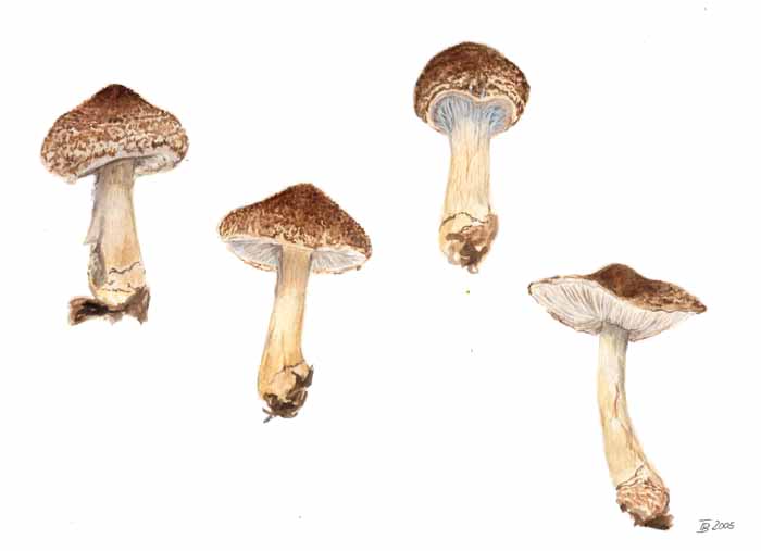 Schleier-Schirmling (Lepiota cortinarius), mit auffallender Cortina und auf den ersten Blick an einen Stachelschirmling (Echinoderma) erinnernd: