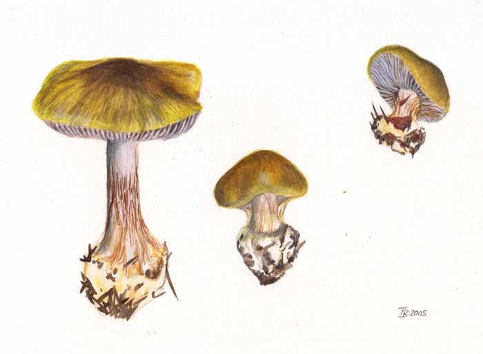 Goldstaub-Klumpfuß (Cortinarius aureopulverulentus), mit eosinroter Laugenreaktion an Hut- und Knollenrand: