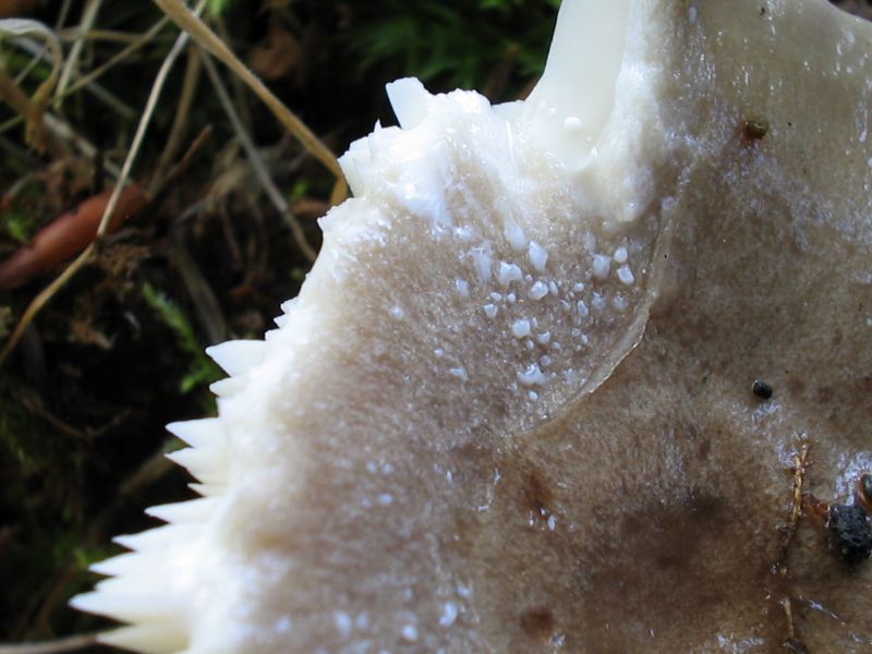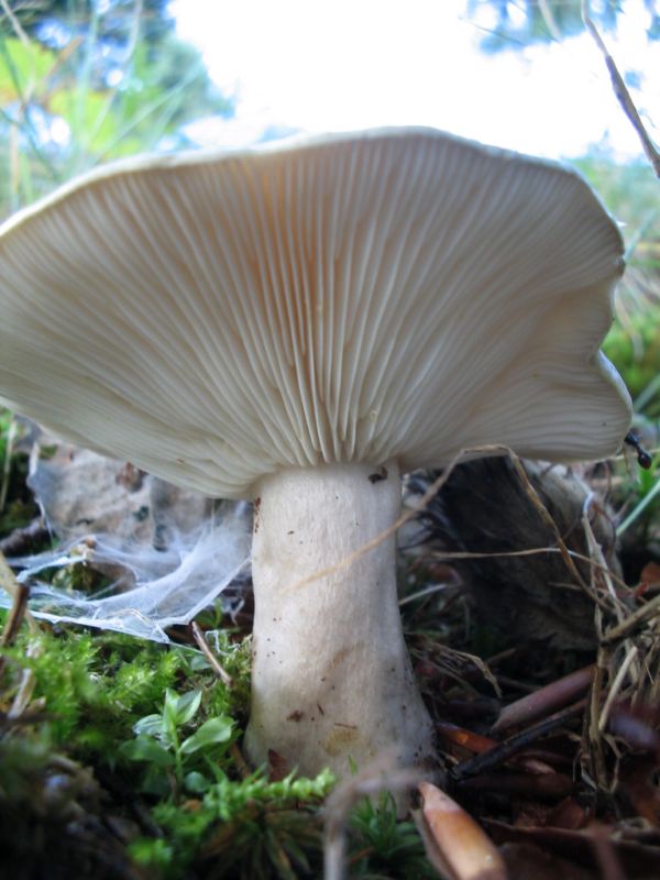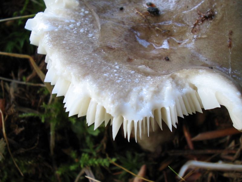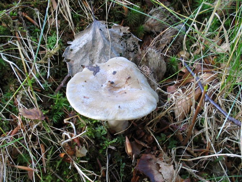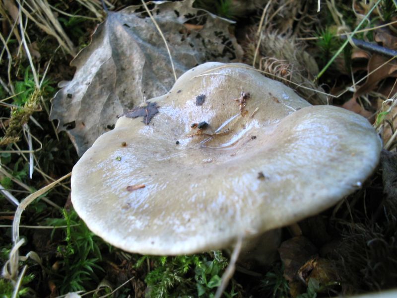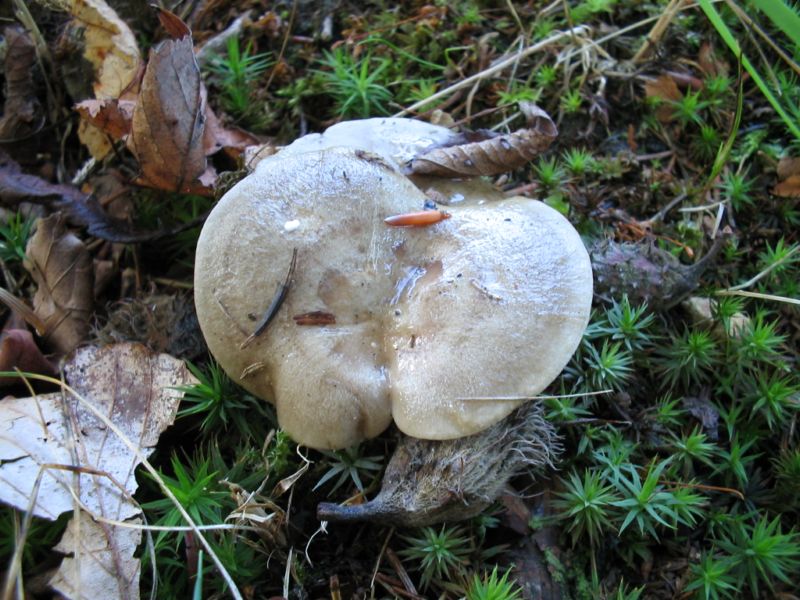 Hallo Lactarius – Fans, Im Folgenden, ein mir Unbekannter Milchling, der momentan sehr häufig im Wald unter Fichten auf sandigem Boden vorkommt. Hut: blasse grün/graue Töne, mit schwach violetten Ringzonen, Oberfläche schmierig, unter der Huthaut grau-violett, Mitte etwas eingedrückt. Die äußerste Hut-Zone ist deutlich heller.