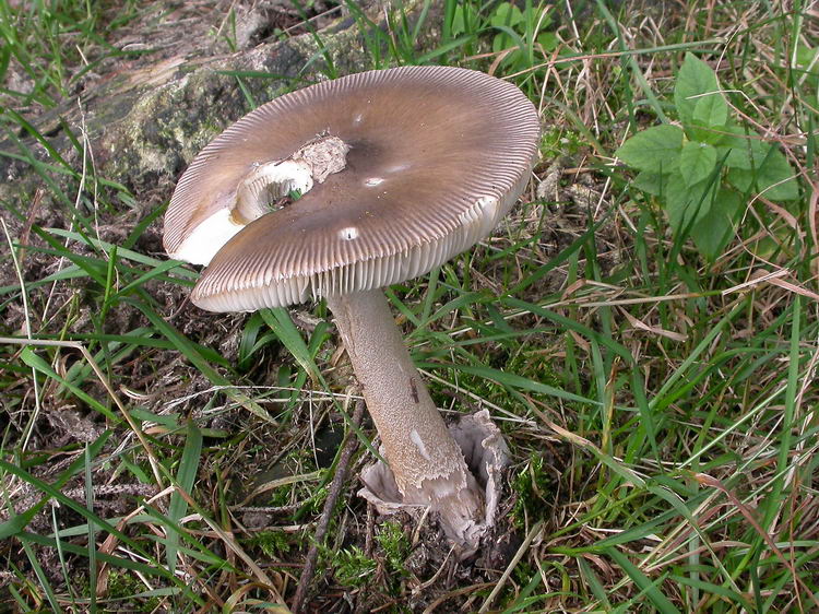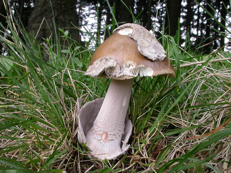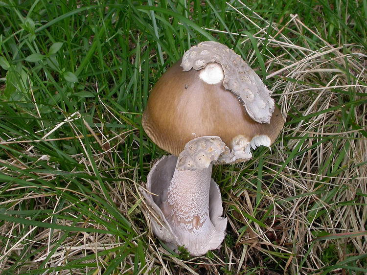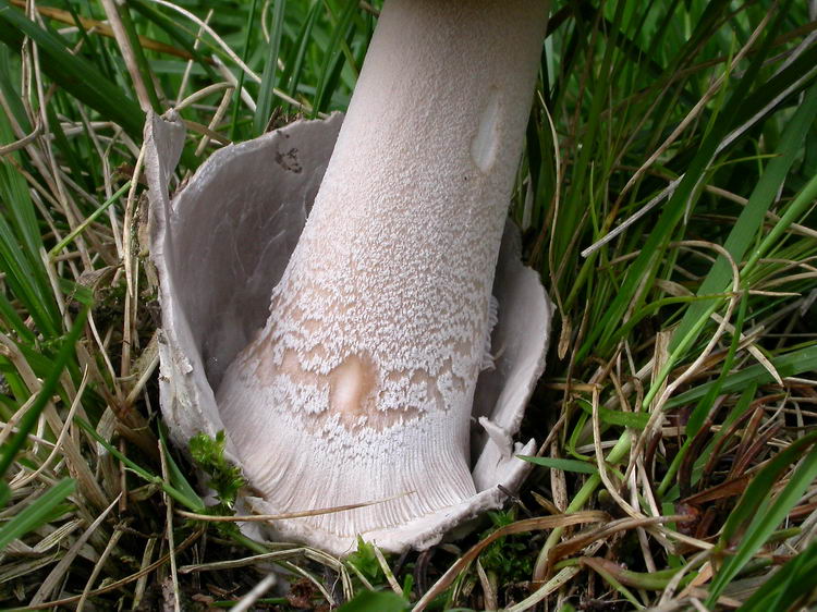 Hier die Infos im Einzelnen: Hut: 12 cm breit, graubraun mit stumpfem, dunkelbraunem Buckel, mit großen Velumresten, diese grau, gemustert, flaumig und mit ockerfarbenen Schüppchen;