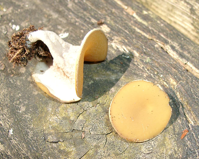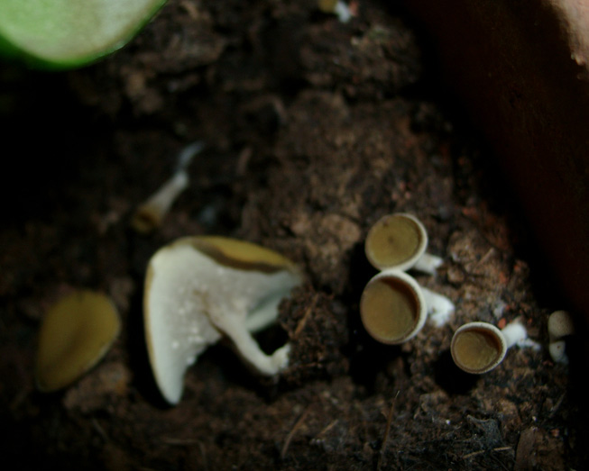 Die Fruchtkörper wuchsen im Blumentopf im Flur eines Bauernhaus, standen also eher kühl. Abgesehen von den mäßigen Fotos habe ich sie leider nicht untersucht geschweige denn aufgehoben. Ich glaube, sie waren eher zäh denn weich, die Oberseite ist glatt und (etwas) speckig, die Unterseite kleiig-rauh gewesen. Auffällig sind die Zweifarbigkeit von Ober- und Unterseite mit einem weißen Rand bei Draufsicht und die +- kreisrunde Form. Die Farbe lag so zwischen den beiden Bildern, gedecktes ockerorange.