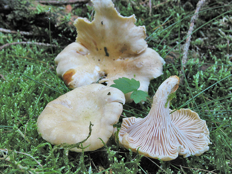 1) Zuerst ein Leistling, vielleicht Blasser Pfifferling - Cantharelluns pallens. Es waren in der Nähe allerdings nur Fichten (der sollte vor allem unter Buchen und Eichen wachsen?). Geruch kaum wahrnehmbar. Hut- und Stielfarbe hell ocker-gelb, blass. Habítus wie des Pfifferlings, jedoch etwas größer, Stiel nicht so fleischig.