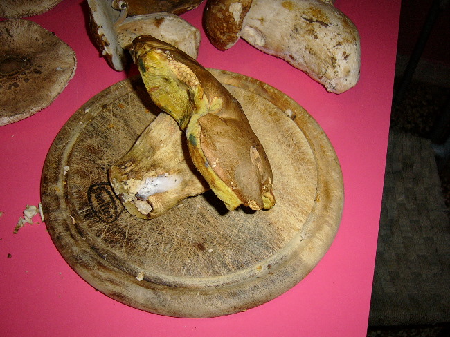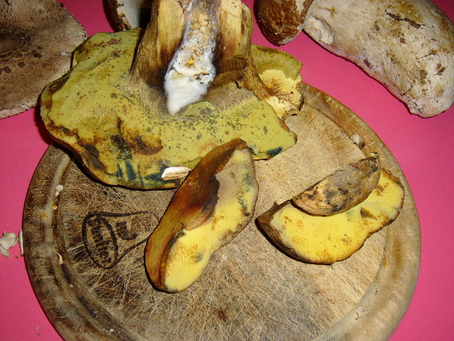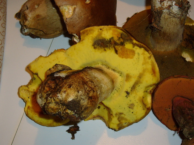 Fotos nicht toll, aber vielleicht erkennt trotzdem jemand den kleinen roten und den großen mit dem gelben Schwamm. Beim Durchschneiden bleute dieser sehr stark und hatte auch einige purporrote Stellen.