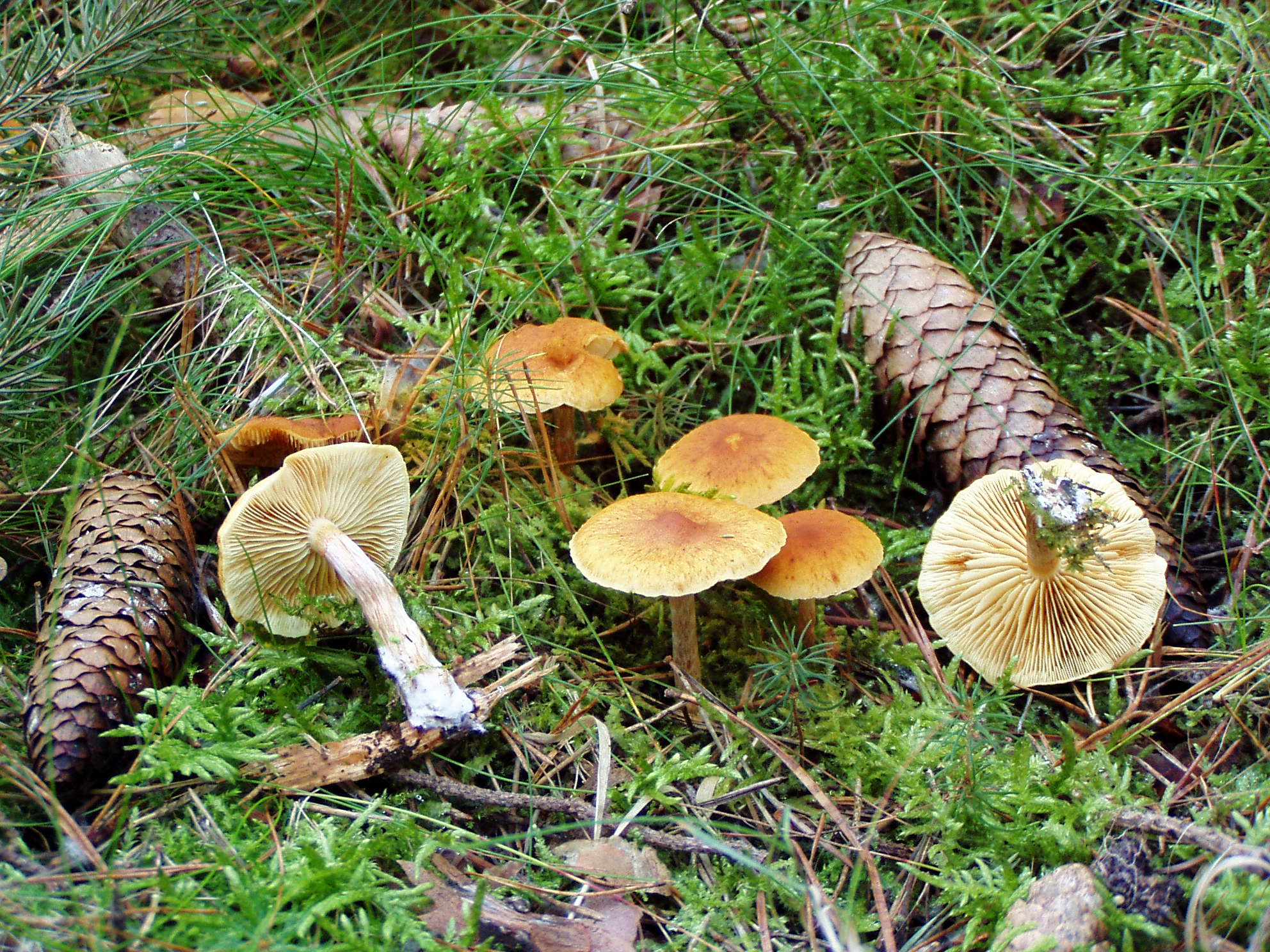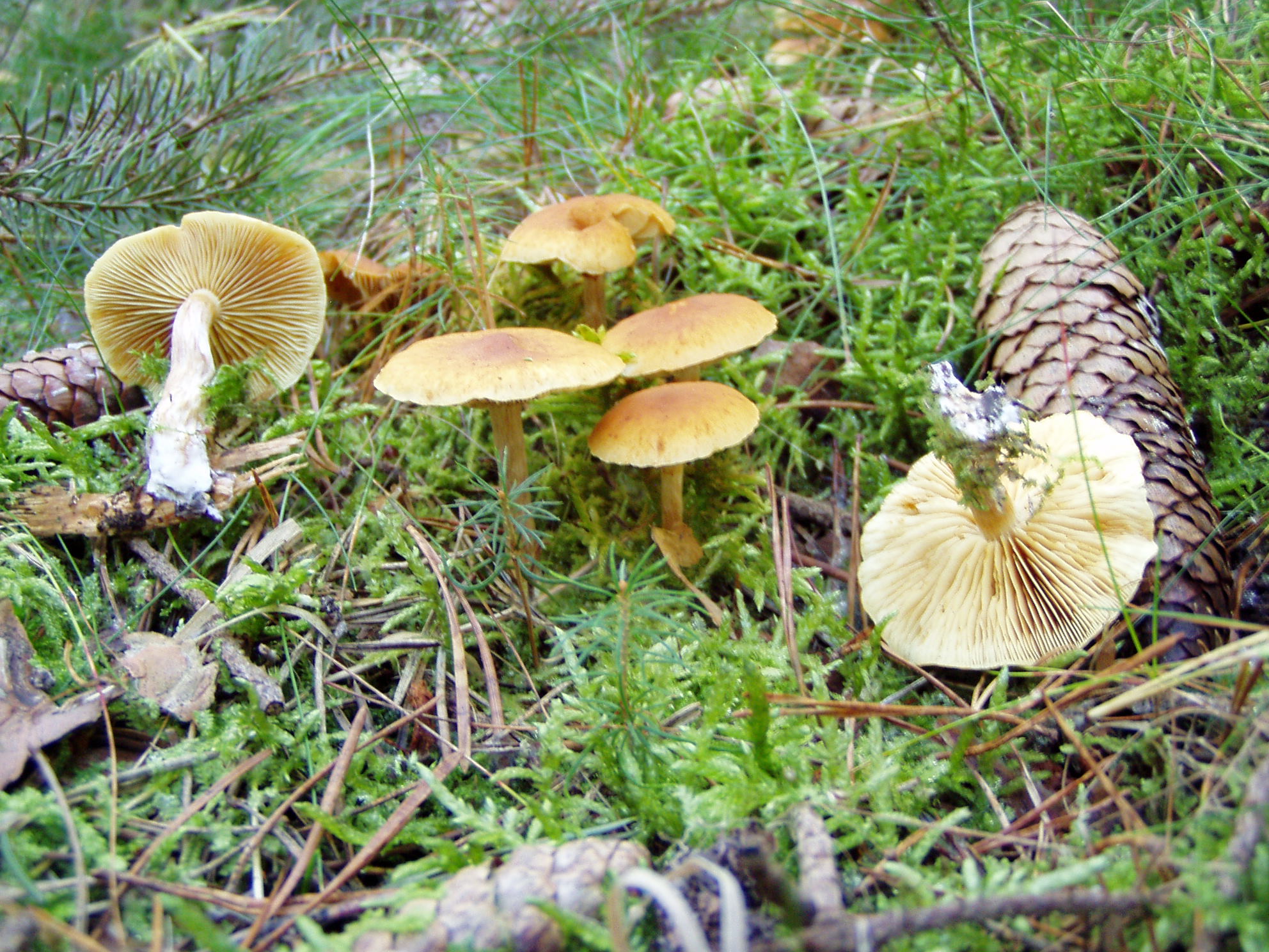 Ich habe am Sonntag die auf den beiden Bildern abgebildeten Pilze in ziemlicher Häufigkeit im Nadelwald auf Holz (unterirdische Äste, Wurzeln) wachsend, gefunden. Der Pilz besitzt orangegelbe Färbung (auch die Lamellen) und riecht holzig (nicht besonders angenehm). Farblich ist er dem Holzritterling etwas ähnlich. In der Größe ist er vergleichbar mit dem Rauchblättrigen Schwefelkopf (ist natürlich keiner, klar).