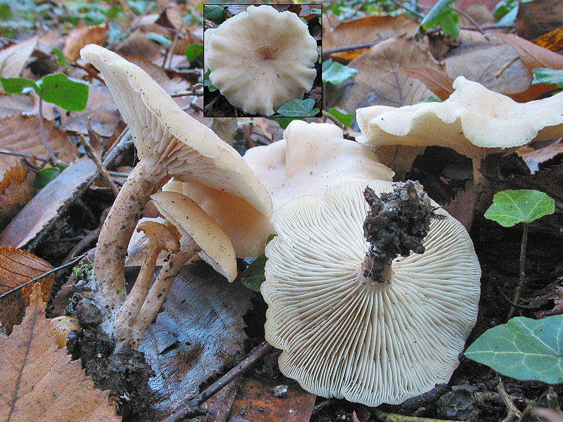 2) Dann ein Trichterling (so glaube ich), Huthaut hygrophan (beim Austrocknen fast weiß), Stiel knorpelig zäh, Geruch unangenehm. Hutdurchmesser ca. 5-10cm. Spp. weiss. Standort - unter alten Birken auf humusreichem Boden: