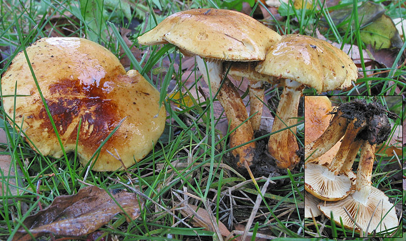 4) Und schließlich der letzte, vielleicht doch ein Flämmling, etwas an den Geflecktblättrigen Flämmling (Gymnopilus penetrans) erinnernd, jedoch die Huthaut klebrig, Stiel zur Basis braun längsfaserig, Stielspitze hell, Sporenpulver leuchtend dunkel-gelb-tabak-braun, Geschmack bitter: