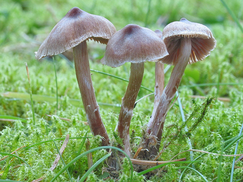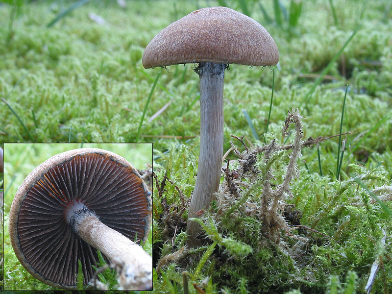 5) Am Ende direkt vor meiner Haustür unter einer Fichte, viele Cortinario-Rissspilze. Spp. zwischen schmutzig-braun und tabak-braun. Hutdurchmesser etwa 1-2cm: