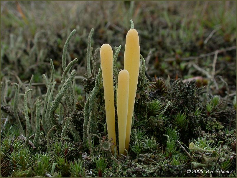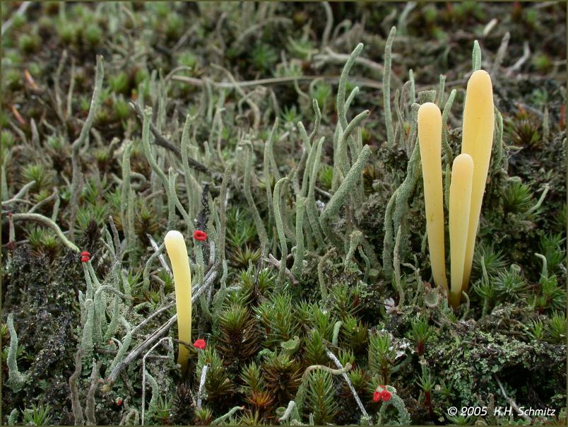 Heidekeulchen, Clavaruia argillacea, inmitten von Flechten