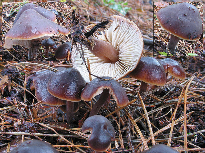 Heute im Rombergpark in Dortmund. Die Bäume dort sind teilweise sehr exotisch, so auch die Kiefern, unter denen die Pilze wachsen: 1) Zuerst ein dem Butter-Rübling ähnlicher Pilz, insgesamt ist aber der Habitus sehr dunkel - die Sporenpulverfarbe zwischen fleischrosa und ocker (nicht dunkel). Standort unter Kiefern, in der Nähe waren auch Birken (Heidelandschaft des Rombergparks).