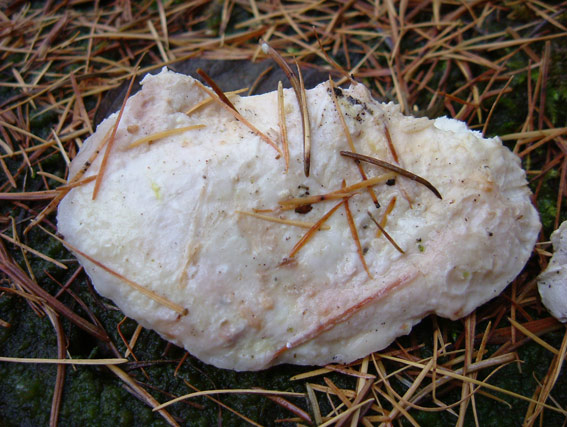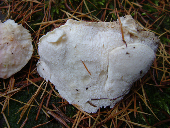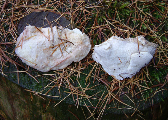 An Fichte, das linke Exemplar hat rosafarbene und ockerliche Flecken an der Hutoberseite an den Röhren das gleiche Rosa.