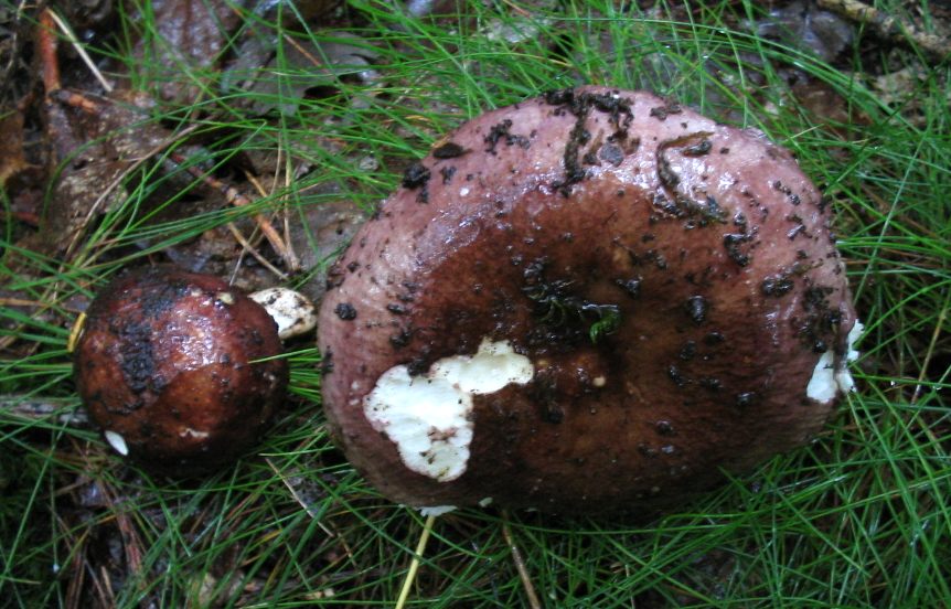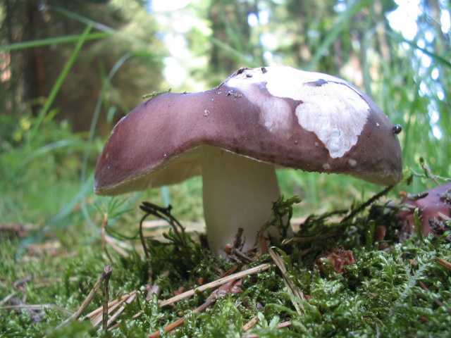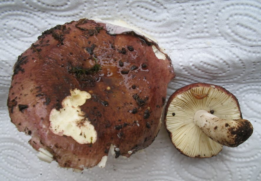 Violettbrauner Täubling Russula brunneoviolacea Ein milder Täubling mit typischem violettbraunem Hut, der nur nach Regen glänzt. Sporenpulver: cremefarben. Er kommt auf saurem Boden vor, der Stiel läuft nicht immer gelb an.
