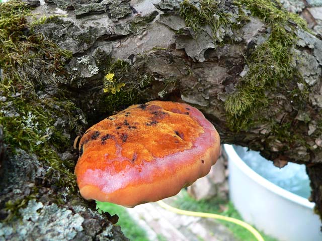 war doch kürzlich vom tropfenden Schillerporling die Rede. Das hat mich erinnert, dass ich in Nachbars Garten einen tropfenden Schillerporling fotografiert und will ihn euch nicht vorenthalten.