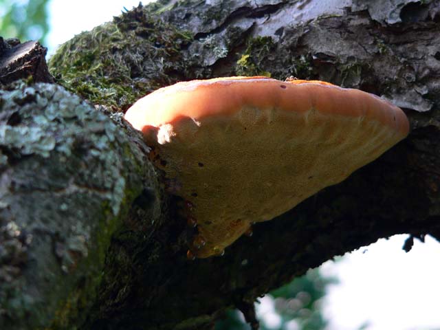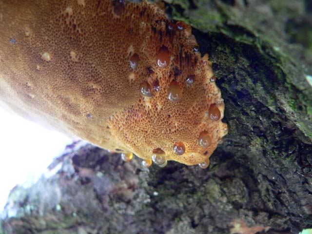 Jetzt, wo ich dabei bin, habe ich gerade noch rechtzeitig bemerkt, dass er zwar tropfte (in der Hitzeperiode!), aber es nicht der tropfende, sondern der zottige Schillerporling war. Leider keine Seltenheit an meinen Apfelbäumen.