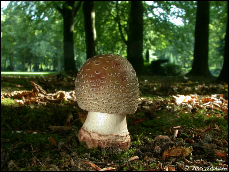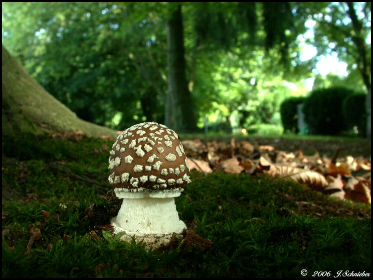 Bei meinem Besuch auf einem unserer Friedhöfe mit Karl-Heinz und Rainer Wald fanden wir viele gerade durchbrechende Pilze: Pantherpilz Amanita pantherina