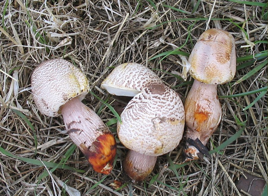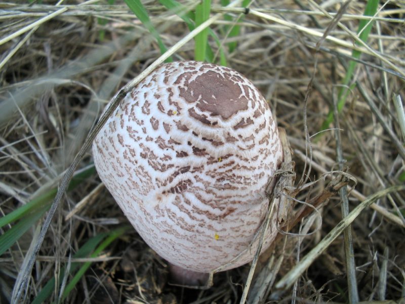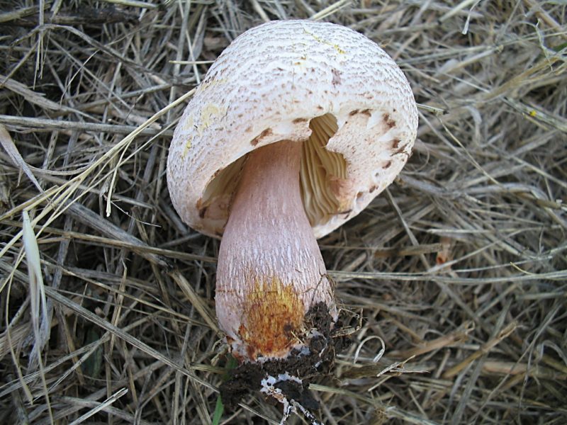 Hut: Weiß mit violettem (purpurn) Schein und braunen Flöckchen, bei Berührung gilbend