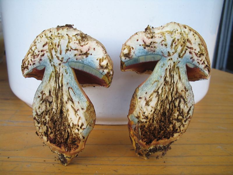 Was mich jetzt völlig verwirrt ist das Schnittbild von dem liegenden Fruchtkörper auf Bild 2: Blauen nur über den Röhren und in im oberen Stielbereich: