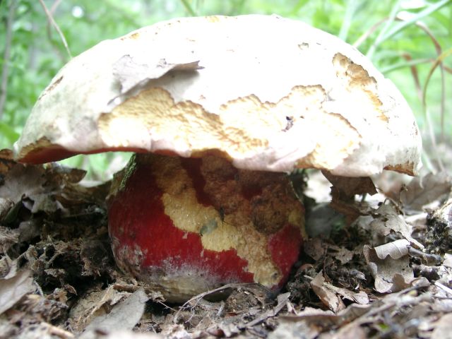 nach dem Bild würde ich den auch satanas nennen, aber in Wirklichkeit hat der viel dunkleres, gelbes Fleisch. stielnetz ist leider abgefressen, überhaupt waren viele Pilze bis auf den Stumpf von Schnecken abgenagt. ich weiss schon wie rhodoxanthus aussehen, zum Vergleich hier welche vom letzten Jahr, auch bei Wien: