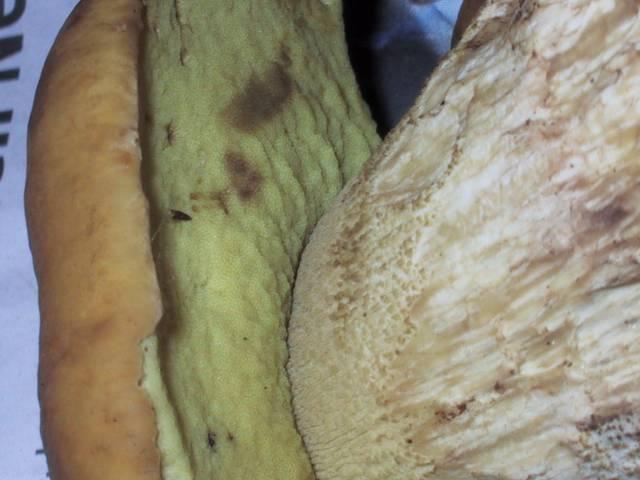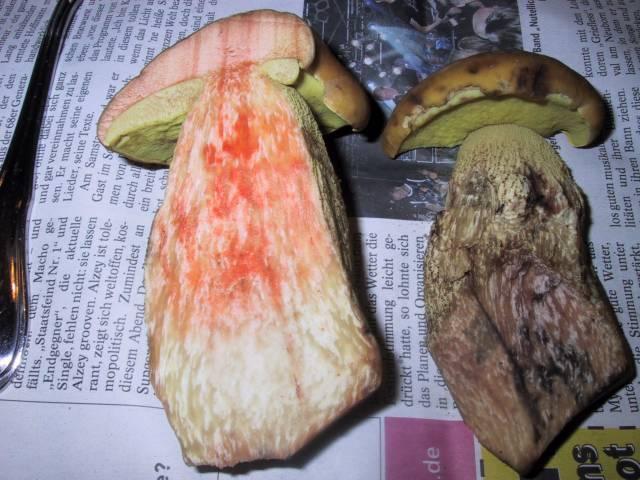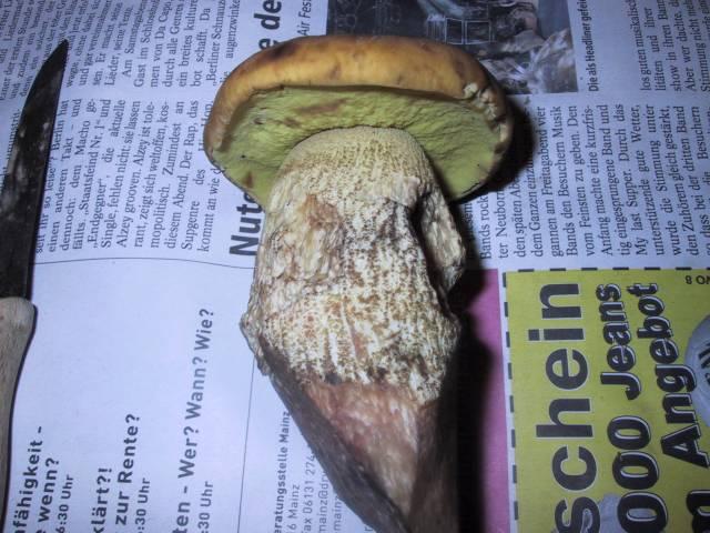 Der Stiel rauhfußähnlich, aber bauchig ähnlich Boletus..festes Fleisch wie bei Rotkappen. Im Schnitt deutlich rötend, mit der Zeit undeutlich schwarzfleckig.