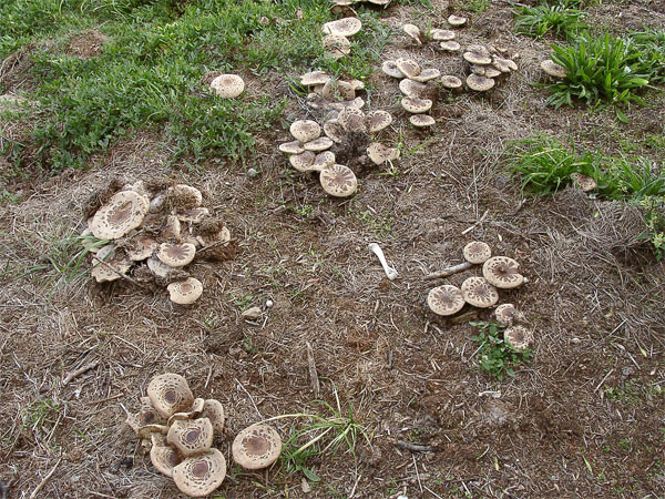 Hallo zusammen, heute gefunden: Massenaufkommen von Schirmlingen. Die Fruchtkörper wachsen an einer Stelle, au der lange Zeit ein sehr großer Heuhafen lag. Das passt perfekt zur Standortbeschreibung für den Giftriesenschirmling, wie er im Bon/ pareys beschrieben ist. Ob es nun der oder doch eher die Gartenform von rhacodes (Safranschirmling ist)