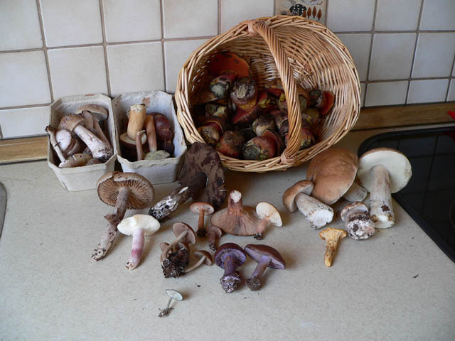 Nach all den Seinpilzberichten habe ich mich auch mal wieder auf die Suche gemacht. Zuerst schien es wie ver(flockenstielig)-hext. Aber dann stand doch plötzlich einer da. Und dann 3 zugleich. Perlpilze und Maronen meist madig. Da ist der Flockie doch ein dankbarer Pilz. Weitgehend verschont von Steinpilz- und Pfifferlingsjägern und meist auch von den Maden. Den düsteren Röhrling habe ich aus Neugier mitgenommen. Wusste nicht mehr wie er schmeckt - hmmm, naja, so schlecht ist er eigentlich nicht. Täublinge habe ich heute bis auf einen links liegen- nein stehen lassen. Daneben fand ich den ersten Pfefferröhrling, Mehlräsling und Fliegenpilz dieses Jahr. (nicht auf dem Bild) Im Vordergrund ein paar Bestimmlinge. Unter anderem einige weißmilchende Milchlinge, die ich nicht einordnen kann. (und auf dem Bild auch nicht bestimmbar sind)