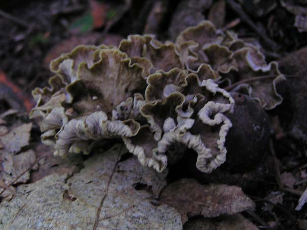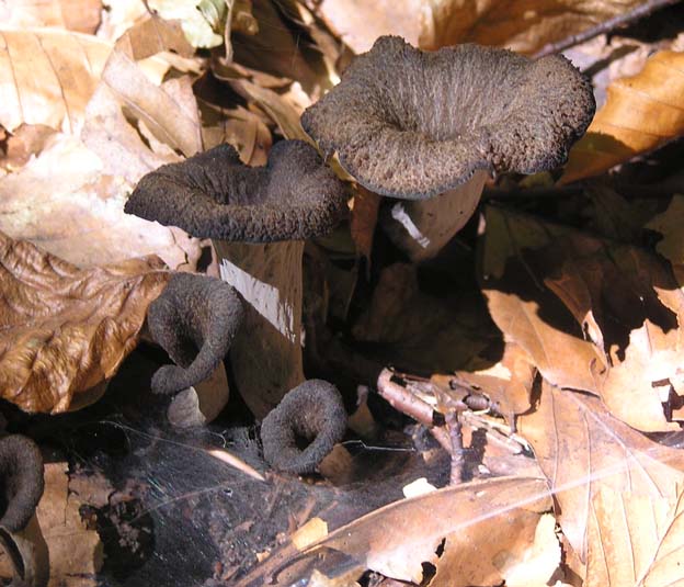 Zum Schluss noch ein bisschen was Krauses (Pseudocraterellus undulatus), nur entdeckt, weil ich das Laub intensiv nach Pfiffis abgesucht habe, die in der Nachbarschaft wachsen, zusammen mit Schwefelritterlingen (Tricholoma sulphureum), pfui, pfui.