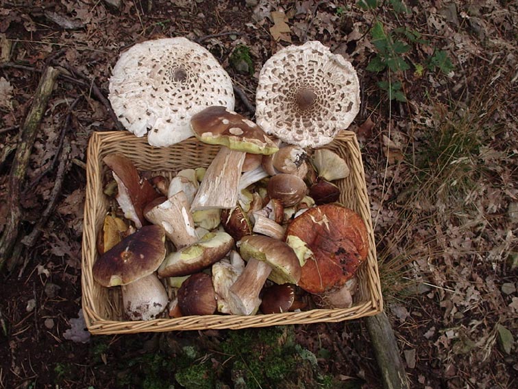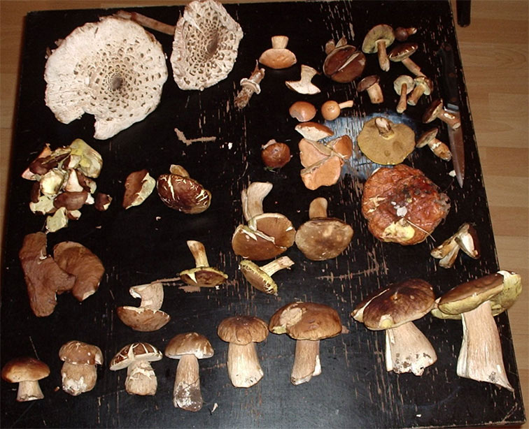 Ich war mir so sicher, dass ich ihn fast gegessen hätte, aber bin dann doch der Regel gefolgt, dass man nichts isst, was man nur aus Büchern kennt. Aber wann kenne ich ihn gut genug, wenn nicht jetzt? Übrigens hat mir ein Sammler noch bestätigt, dass es ein essbarer Parasol sei: weil er ein Loch im Stil habe, wenn man ihn unten durchschneidet. Nun ja, auf Tipps von Leuten, die ich nicht kenne, vertraue ich natürlich nicht in dem Maß, dass ich etwas deswegen essen würde. Es war nur noch ein Hinweis, den ich übrigens sonst noch nirgendwo gefunden habe. Wenn aber Pätzold in seinem "1 x 1" diesen oben zitierten Hinweis gibt, dann muss er doch damit meinen, dass auch unsichere Sammler Pilze essen dürfen, wenn sie solche eindeutigen Merkmale befolgen (die sie auch verstanden haben). Und nicht jedes Mal zum Pilzberater müssen. Oder nicht? Mittlerweile finde ich es fast schon ein bisschen übertrieben, dass ich den Parasol immer noch nicht esse....und wäre wirklich gespannt, von erfahrenen Sammlern zu hören, was sie einem Anfänger wie mir zum Thema "Vertrautheit mit Pilzen erlangen" sagen können. Auch den Violettgrünen Frauentäubling haben wir schon zwei mal aus dem Wald mitgebracht und bestimmt. Sind auch relativ sicher. Wenn auch noch weit entfernt von der Parasol-"Sicherheit". Und bei dem käme ich auch nicht auf die Idee, ihn zu essen, ohne jemand Kompetentes zu fragen (bei dem Täubling). Puh, sorry, wurde etwas lang. Aber ist halt eine grundsätzliche Frage zum Umgang von Anfängern mit unbekannten Pilzen. Die mir eben mittlerweile gar nicht mehr unbekannt scheinen. Vielleicht ist das ja auch für andere Änfänger interessant, was Experten dazu sagen würden. Zum Schluss noch zwei Bilder meiner Gesamtsammlung aus der Eifel von Samstag, mit der ich hier bei den Profis sicher niemanden weiter beeindrucken kann. Vielleicht kann mir ja jemand noch einen Tipp geben, um welchen Pilz es sich bei dem nett anzusehenden untersten Bild handelt. Und jetzt bin ich wirklich gespannt auf Reaktionen....