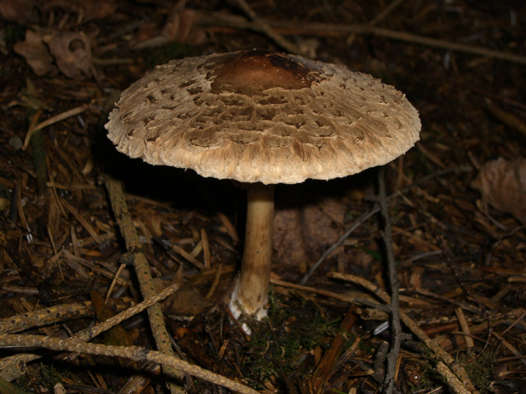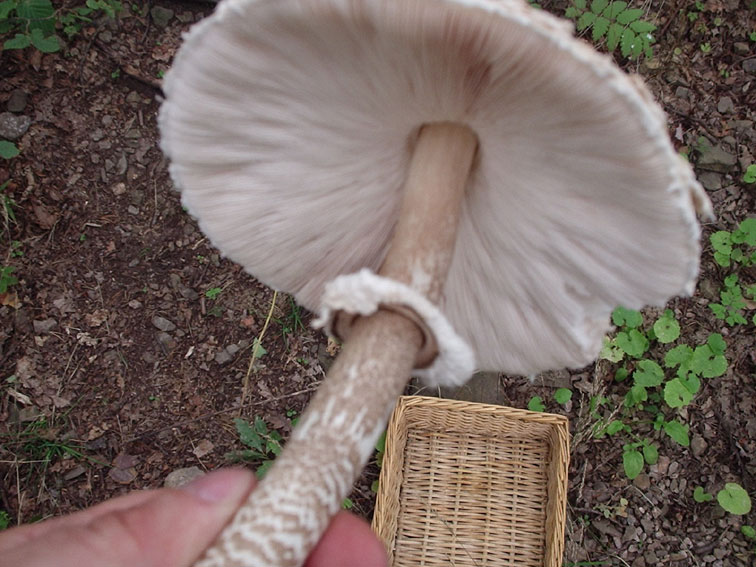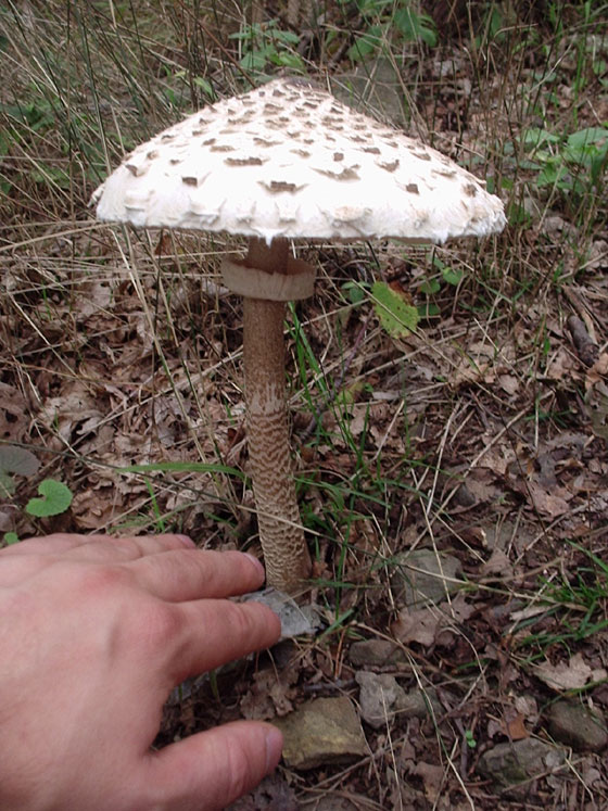 Nachdem ich mir u.a. hier im Forum zig Bilder von Parasolen und Verwandten angeschaut habe und vor allem auch die Regel aus meinem "1 x 1" von Pätzold ("der unsichere Sammler nimmt Arten mit genattertem Stil, die im Schnitt nicht röten und ist damit auf der sicheren Seite!") mir in Fleisch und Blut übergegangen ist, war ich mir nun im Wald ganz, wirklich ganz (wehe, das stimmt jetzt nicht!:) sicher, dass folgender Pilz ein Parasol ist (das Wort "genattert" verwandelte sich zB von Theorie schlagartig in Praxis, der Pilz wurde mir plötzlich vertraut sozusagen*g - außerdem gab es keinerlei Rötung im Schnitt, weder am Hut, noch im Stil):