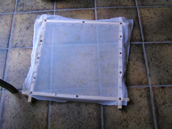 Ich habe einen Seidenmalrahmen genommen (oder einfach 4 Latten zusammenschrauben) und mit einem Stück Gardinenstoff bespannt.